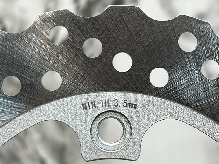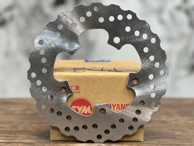 -در واقع قطعهای دایرهای شکل است از جنس فولاد که عامل اصلی توقف موتورسیکلت محسوب میشود. این قطعه که نقشی حیاتی در سیستم ترمز دارد همراه با چرخها میچرخد. وابستگی این دو به هم به گونهای است که توقف دیسک موجب توقف چرخها و به دنبال آن توقف کامل موتورسیکلت میشود.