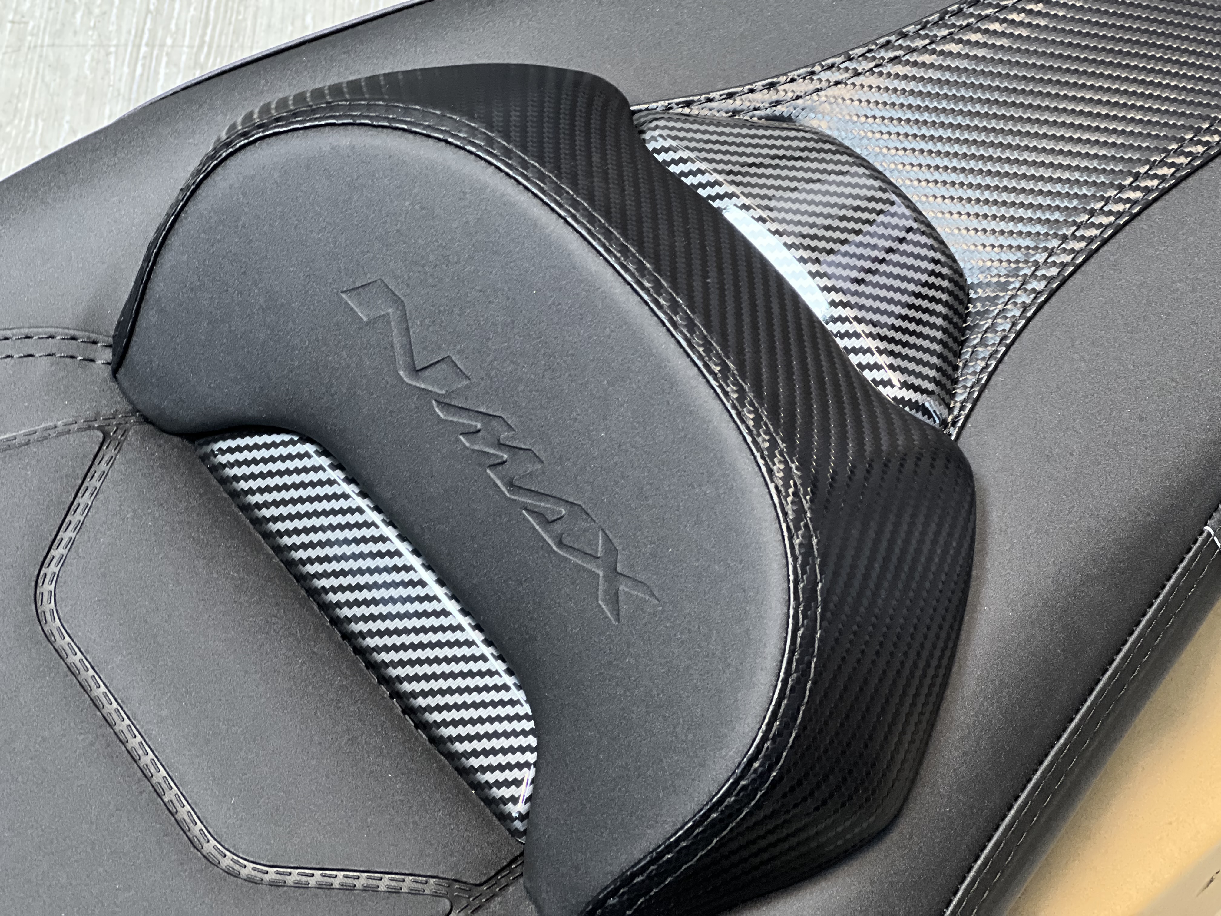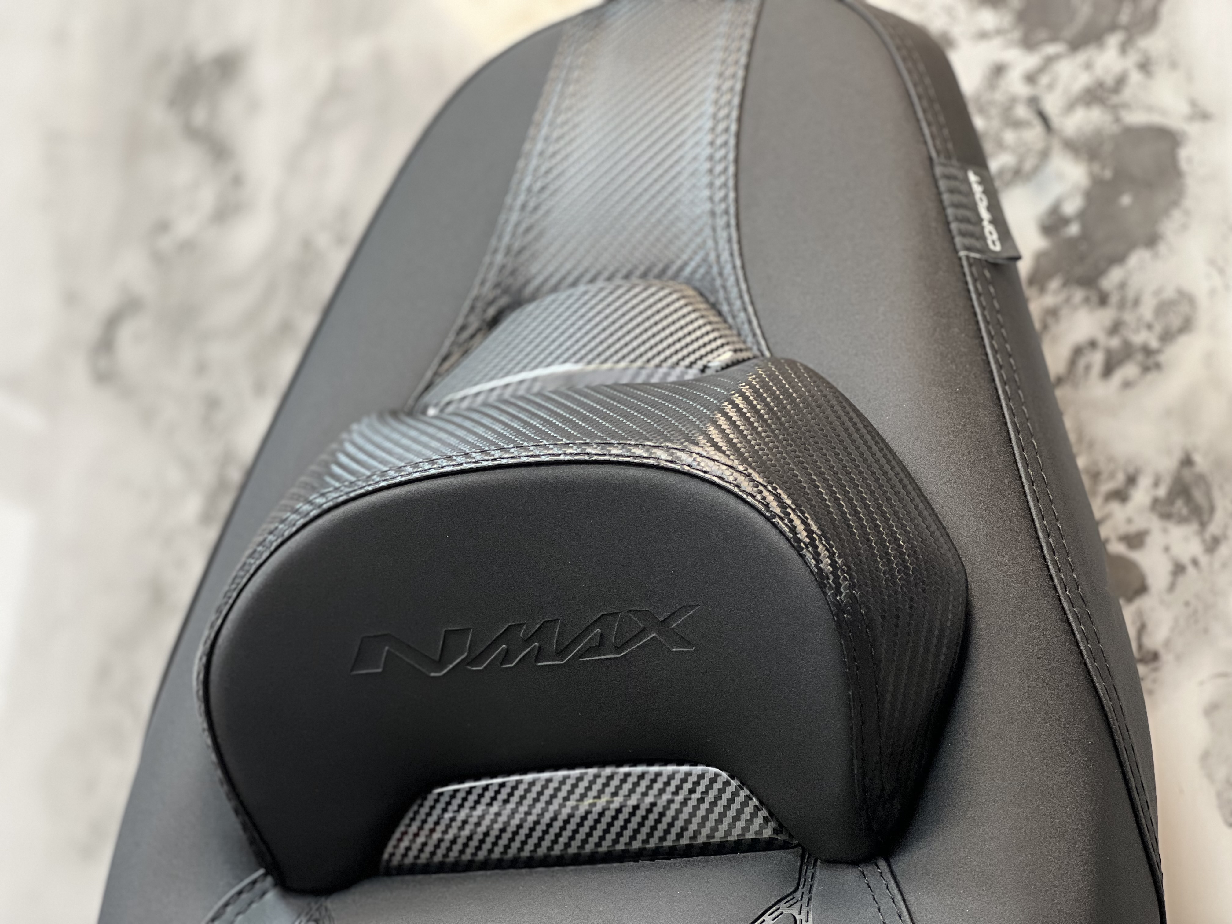 در مقابل زین اسپرت اسپیشیال کربن اصل ساخت تایلند با فوم استاندارد روکش مقاوم و طراحی اصولی راحتی پایدار ظاهر حرفهای و طول عمر بالا را برای N-MAX Turbo فراهم میکند