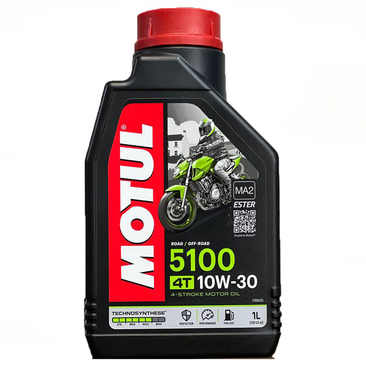 روغن موتور سیکلت Motul 5100 10W30یک روان کننده کاملاً سنتتیک استر است که برای موتورسیکلت های با کارایی بالا، موتورهای اسپرت، موتورهای خیابانی و جاده ای، موتورهای خارج از جاده، موتورهای اندرو و تریال، موتورهای 4 زمانه مجهز به گیربکس یکپارچه یا غیر یکپارچه، کلاچ مرطوب یا خشک، و موتورهای مطابق با استانداردهای آلایندگی یورو 2 یا یورو 3 و مجهز به سیستم های تصفیه گازهای خروجی مانند مبدل های کاتالیزوری و تزریق هوا به اگزوز طراحی شده است.
